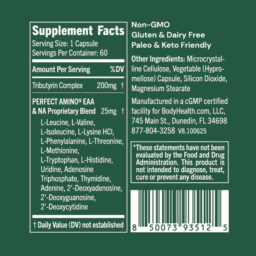 Postbiotisk tributyrin for sterkere tarmbarriere, bedre mikrobiom og optimalt næringsopptak. Støtter immunforsvaret, hudens klarhet og kognitiv funksjon via tarm-til-hjerne-aksen. Beriket med PerfectAmino® for effektiv cellulær reparasjon og metabolsk støtte. 60 vegetariske kapsler – 1–2 per dag for balansert tarmhelse.
