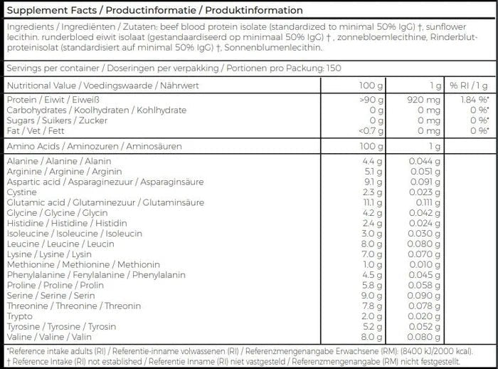 Ingredienser: 100 % blodproteinisolat fra gressfôrede kyr (New Zealand)