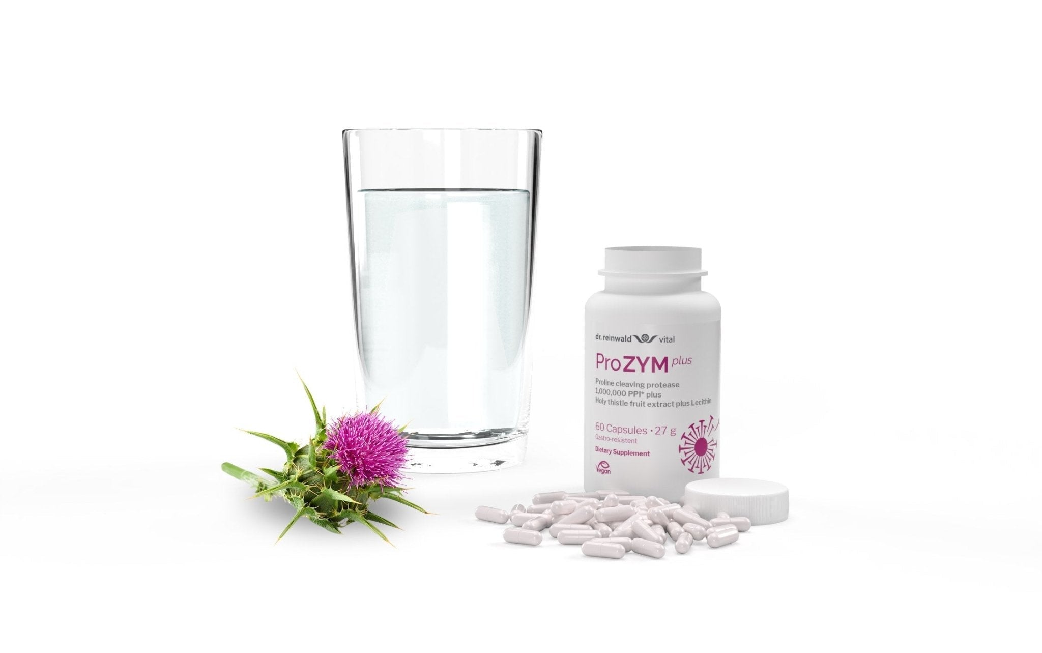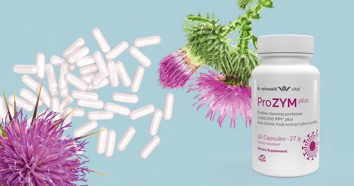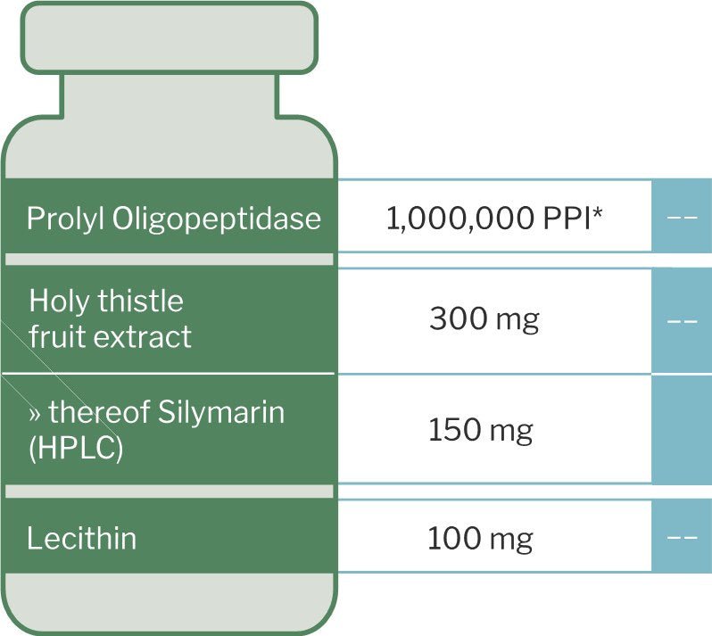 Vår prolyl oligopeptidase har maksimal enzymaktivitet og er høyt dosert med 1 000 000 PPI* per daglig anbefaling. I tillegg bruker vi tistelekstrakt av høyeste kvalitet. Planten-til-ekstrakt-forholdet er 10:1, noe som betyr at en daglig dose med 2 kapsler ProZYM gir 300 mg holistisk, høyt konsentrert rot-ekstrakt, som tilsvarer 3 g tørr plantemasse.
