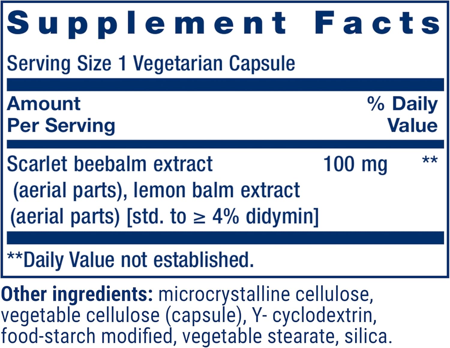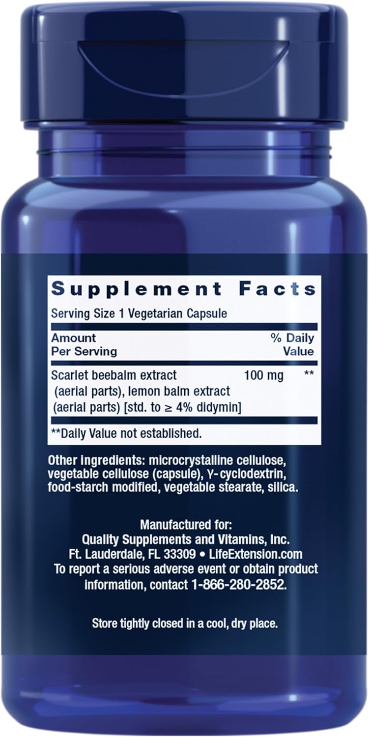 Innhold per kapsel: Scarlet beebalm-ekstrakt og sitronmelisse-ekstrakt, standardisert til ≥4 % didymin, 100 mg