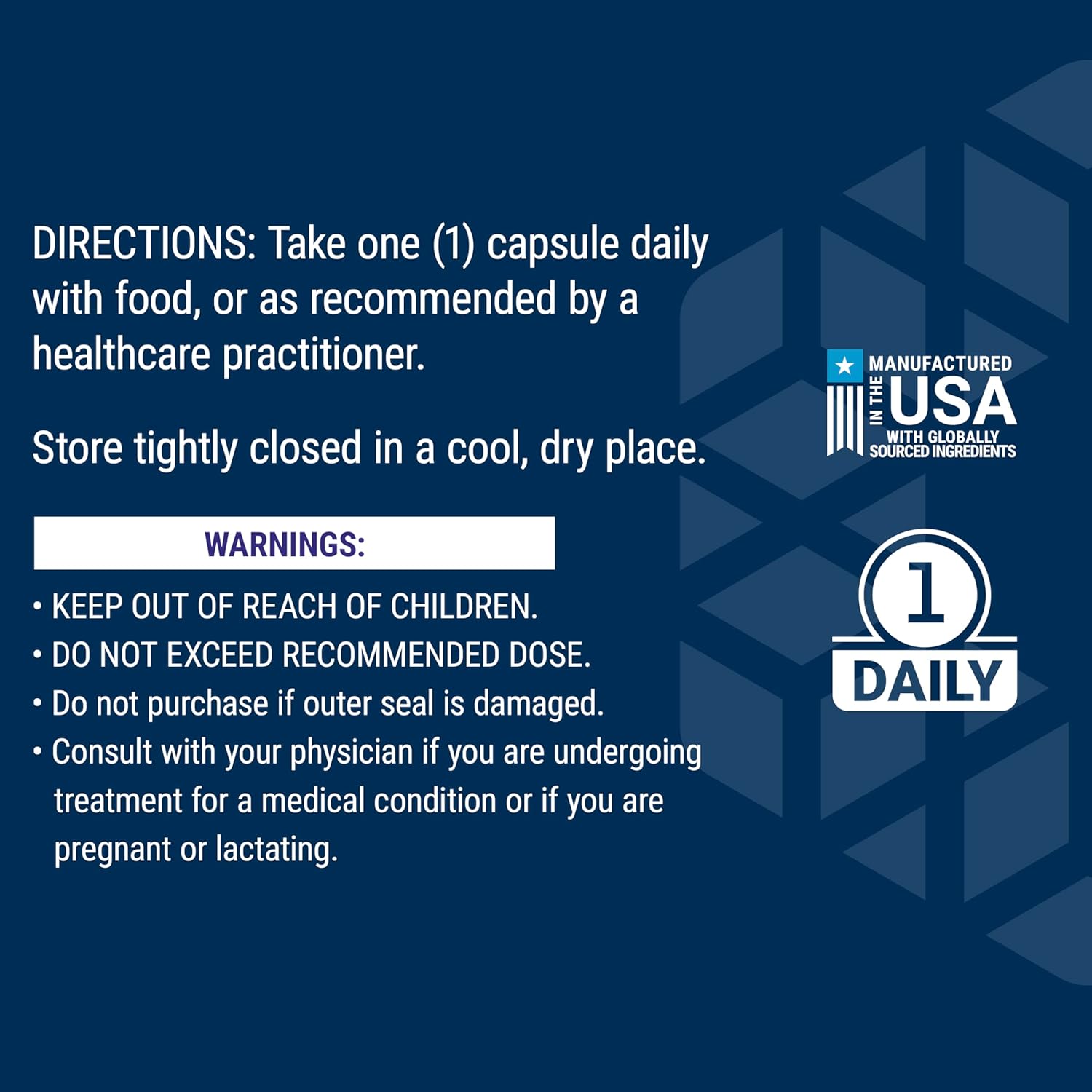 Ta 1 kapsel daglig sammen med mat. Ikke overskrid anbefalt dose. Oppbevares kjølig, tørt og utilgjengelig for barn.