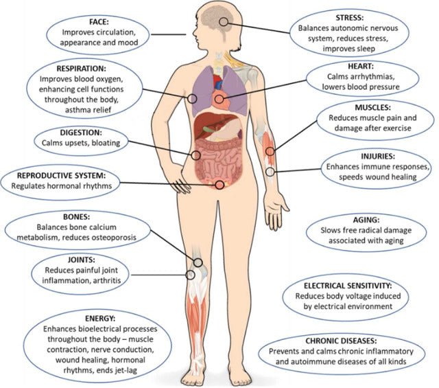 • Elektroner fra jordens potensial strømmer inn i kroppen og kan bidra til å stabilisere elektriske prosesser i cellene.