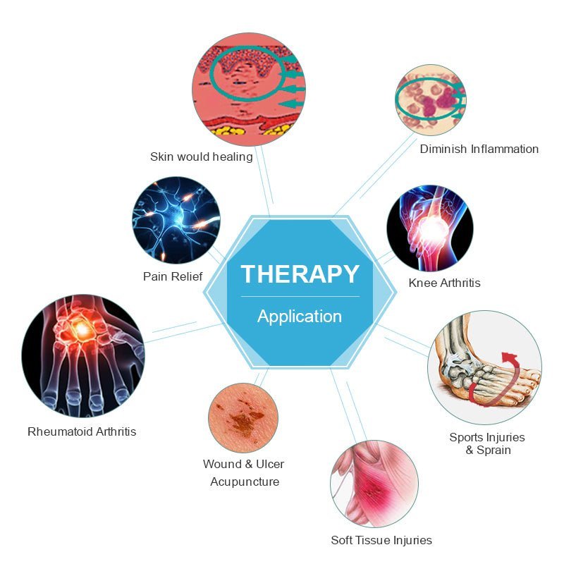 808 nm: Denne bølgelengden er mer egnet for dypere vev og nervegenerasjon. Den når muskel- og skjelettvev og brukes ofte for å behandle dype vevsskader, nerver og ledd.