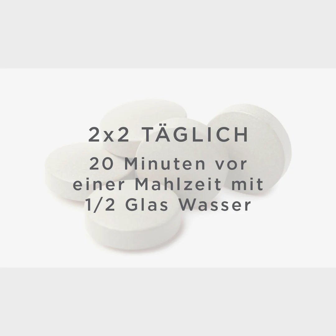 Ta 2 tabletter om morgenen og 2 tabletter til lunsj, helst ca. 20 minutter før måltid, med et halvt glass vann. Regelmessig bruk over tid anbefales for stabil støtte.