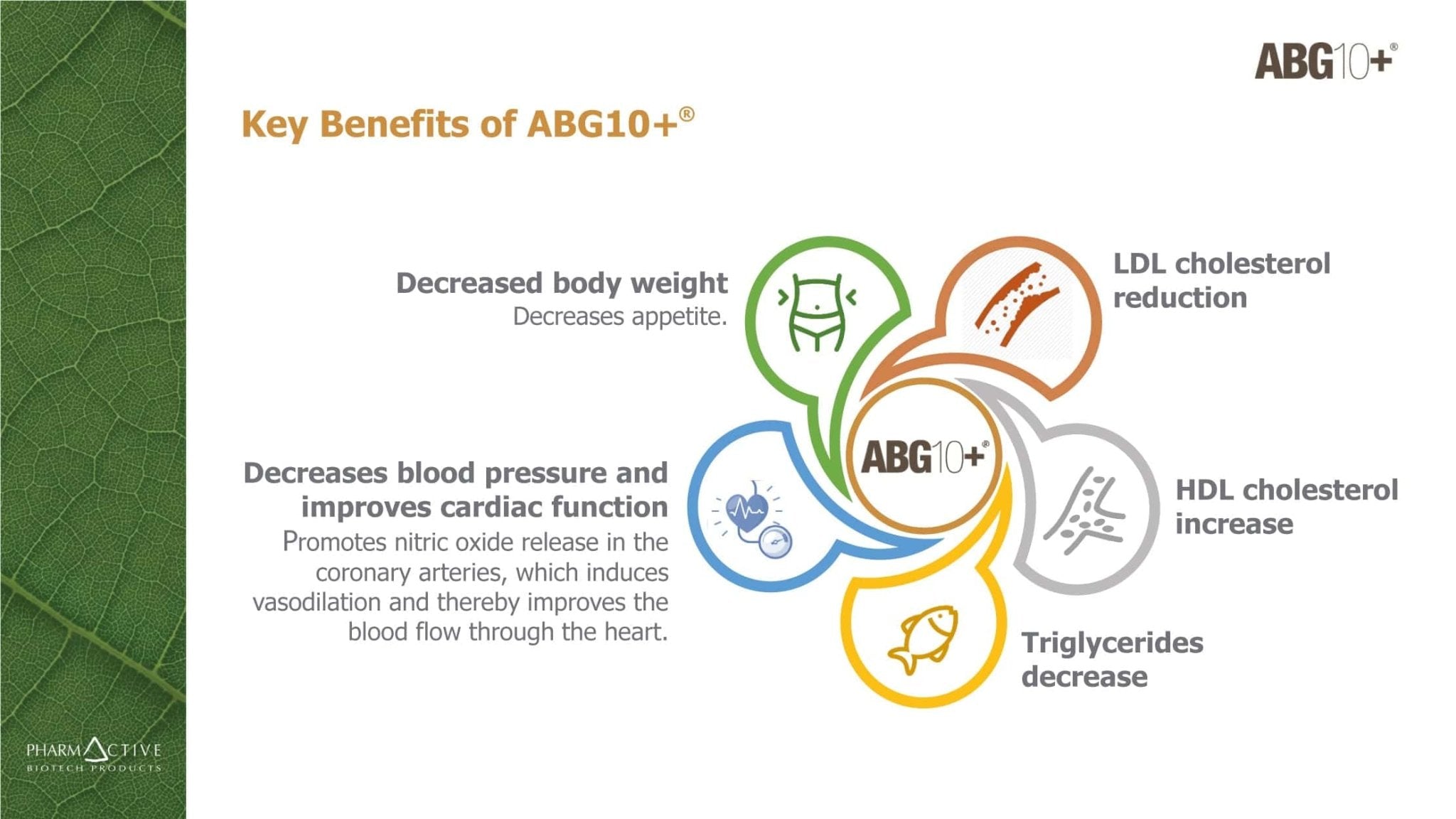 ABG10+® er en unik og patentert formel laget av fermentert svart hvitløk, standardisert til 0,1% S-allyl-cystein (SAC), den viktigste aktive bestanddelen. ABG10+® modnet svart hvitløksekstrakt er mer stabil, bedre fordøyd og inneholder 10 ganger flere antioksidantmolekyler enn fersk hvitløk. Den har klinisk bevist effekt for både hjertehelse og vektkontroll.