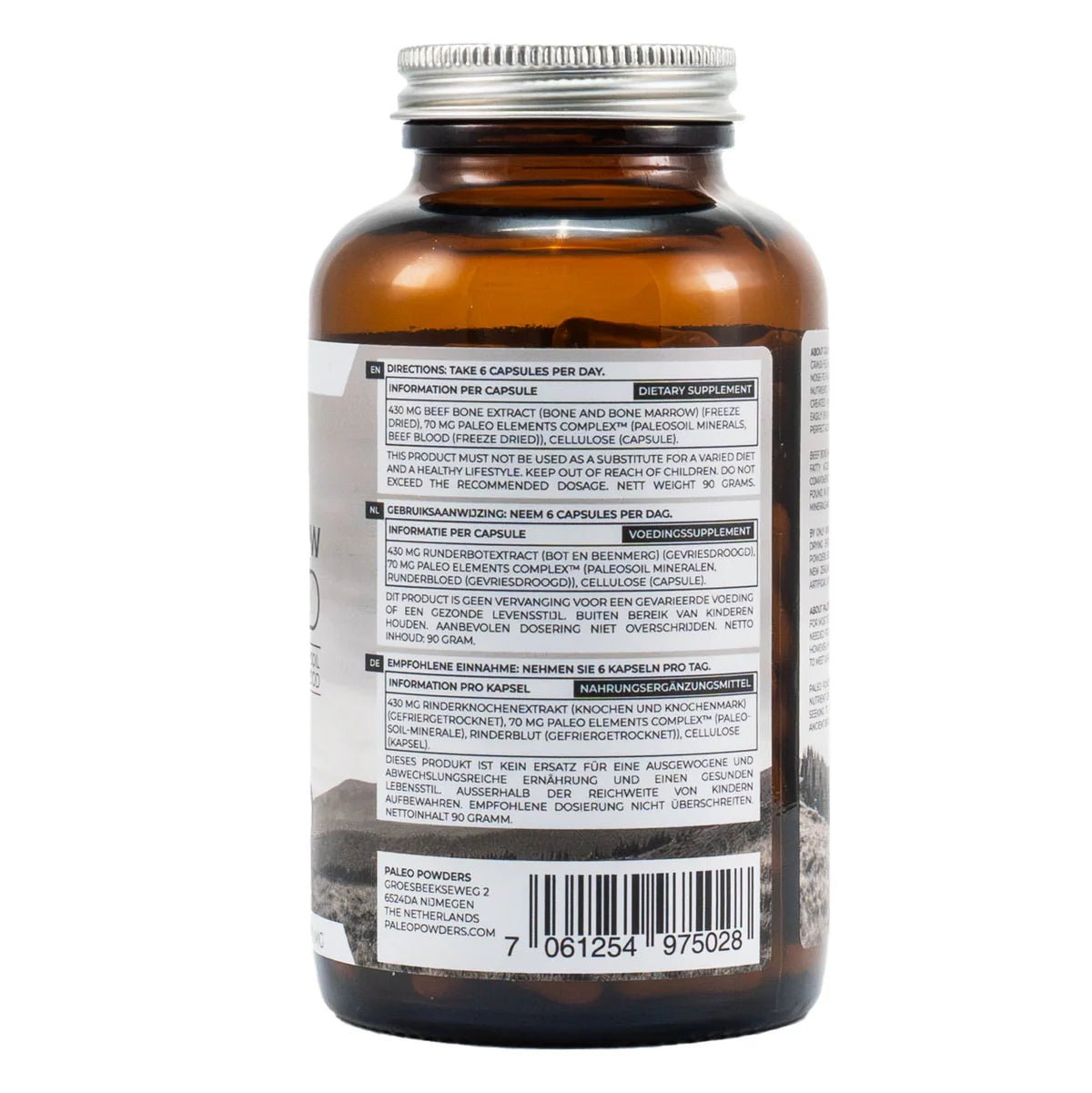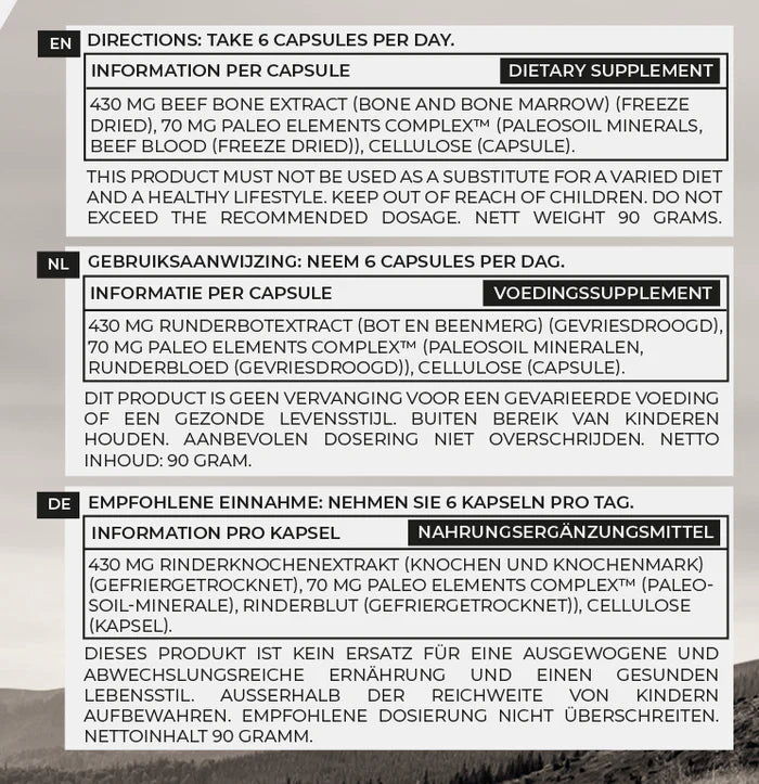 Produktet leveres i 180 kapsler. Hver kapsel inneholder totalt 500 mg innhold, hvorav 430 mg er frysetørket bein- og beinmargsekstrakt og 70 mg er Paleo Elements Complex™. Produsentens offentlige tekst omtaler blant annet fett, proteiner, kollagen, glykosaminoglykaner og fettløselige vitaminer/mineraler som del av den naturlige sammensetningen.