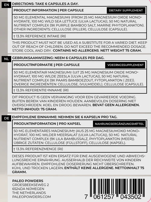 Magnesium – 100 % naturlig fra Paleo Powders er et kosttilskudd utviklet for å bidra til kroppens normale magnesiumbalanse gjennom en kombinasjon av to naturlige og komplementære magnesiumkilder fra havet. Produktet inneholder magnesiumoksid monohydrat fra Dødehavet og helmat-magnesium fra vill sjøsalat (Ulva lactuca), supplert med et marint næringskompleks bestående av marint fytoplankton og koreansk 9× lilla bambussalt. Sammensetningen er valgt for å gi både rask og gradvis tilførsel av magnesium, samtidig som den etterligner mineralmangfoldet som finnes i naturlige marine miljøer.