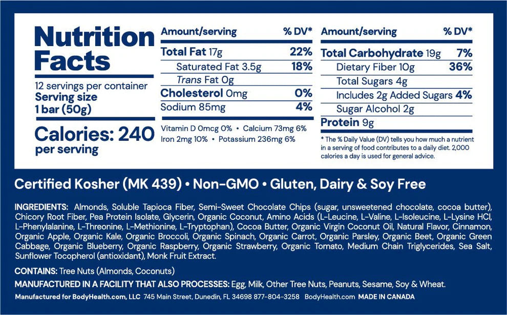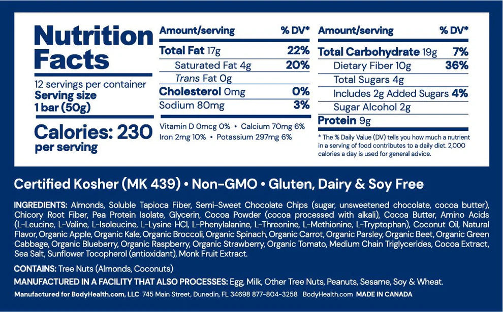 Ingredienser: Mandler (mandelsmør og mandelfiber), tapiokafiber, halvsøte sjokoladebiter (usøtet sjokolade, kakaosmør, monk fruit), chicory root fiber, ertproteinisolat, økologisk kokos, PerfectAmino™ (essensielle aminosyrer), kakaosmør, økologisk jomfru kokosolje, økologisk frukt- og grønnsaksblanding (eple, grønnkål, brokkoli, spinat, gulrot, persille, rødbete, grønnkål, blåbær, bringebær, jordbær, tomat), medium-chain triglyserider, havsalt, kanel, solsikke-tokoferoler (naturlig vitamin E), monk fruit-ekstrakt.