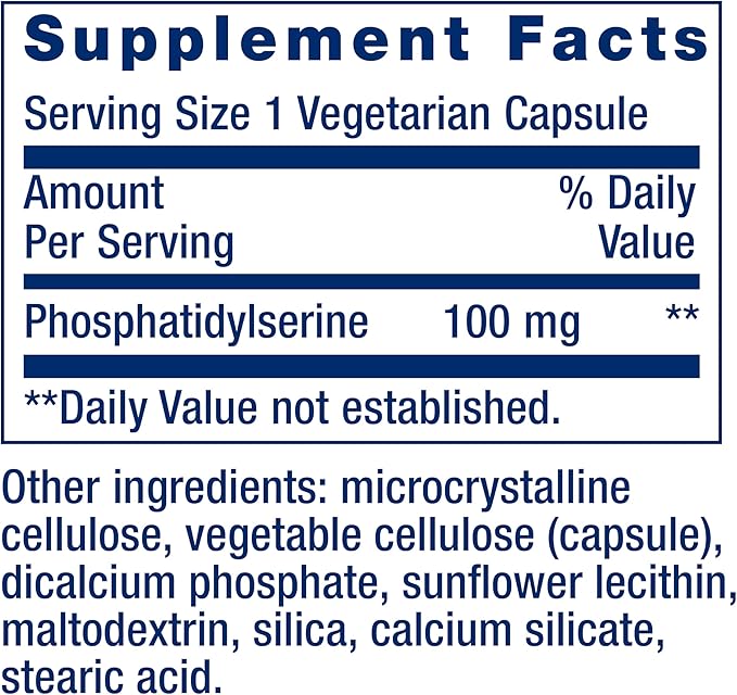 • Ingredienser: Fosfatidylserin (fra solsikkolecitin), mikrokrystallinsk cellulose, vegetabilsk kapsel (cellulose), dikalsiumfosfat, solsikkolecitin, maltodekstrin, silika, kalsiumsilikat, stearinsyre