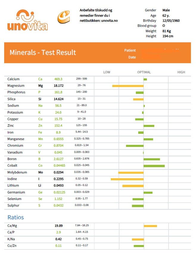 Rapporter: Testresultatene er tilgjengelige umiddelbart etter måling og gir en detaljert oversikt over mineralbalanse, oksidativt stress og tungmetallnivåer i kroppen.