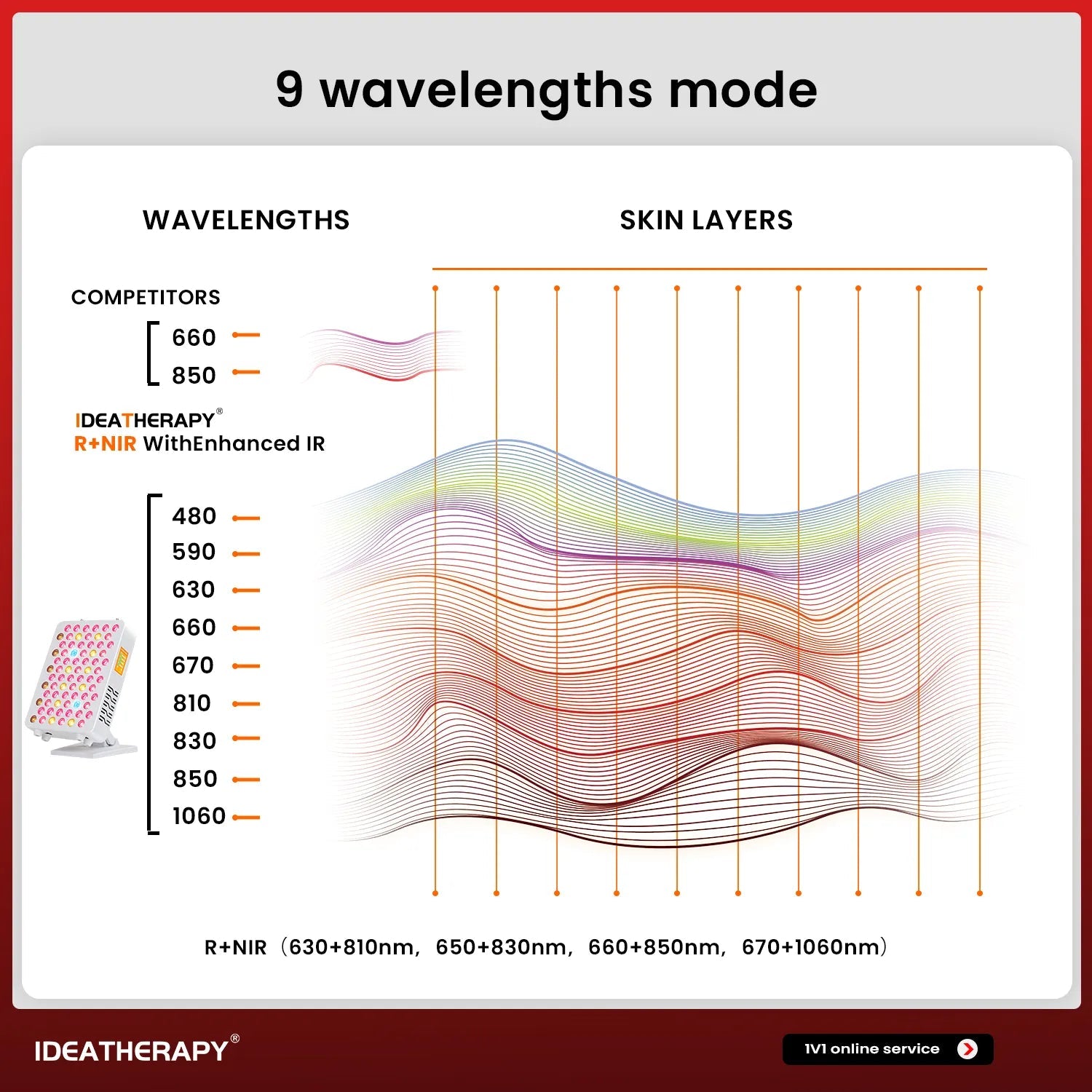RLPRO100 9 Waves dekker følgende bølgelengder: 480 nm, 590 nm, 630 nm, 660 nm, 670 nm, 810 nm, 830 nm, 850 nm og 1060 nm. Kombinasjonen gir fullspektret dekning fra overfladisk hudrelatert lys til dypere vevspenetrasjon. Blått og gult lys brukes primært overfladisk og inngår ofte i hud- og klarhetsrutiner. Rødt lys i området 630–670 nm er sentralt innen fotobiomodulasjon og brukes ofte i sammenheng med hudkvalitet, sirkulasjon og generell cellulær støtte. Nær-infrarødt lys fra 810–1060 nm gir dypere vevspenetrasjon og benyttes ofte i restitusjons-, komfort- og avslapningsorienterte rutiner.